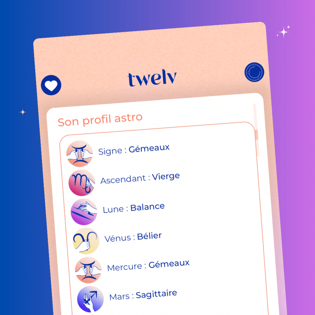 Ton thème astral permet de révéler tes traits de caractère et notamment tes comportements affectifs. Grâce à son algorithme exclusif, Twelv t'aide à choisir des personnes qui te correspondent vraiment. Match assuré avec des planètes alignées !
